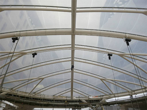 ETFE膜使用壽命至少為25-35年,是用于永久性多層可移動屋頂結(jié)構(gòu)的理想材料。該膜材料多用于跨距為4米的兩層或三層充氣支撐結(jié)構(gòu),也可根據(jù)特殊工程的幾何和氣候條件,增大膜跨距。膜長度以易安裝為標準,一般為15-30米。小跨度的單層結(jié)構(gòu)也可用較小規(guī)格。